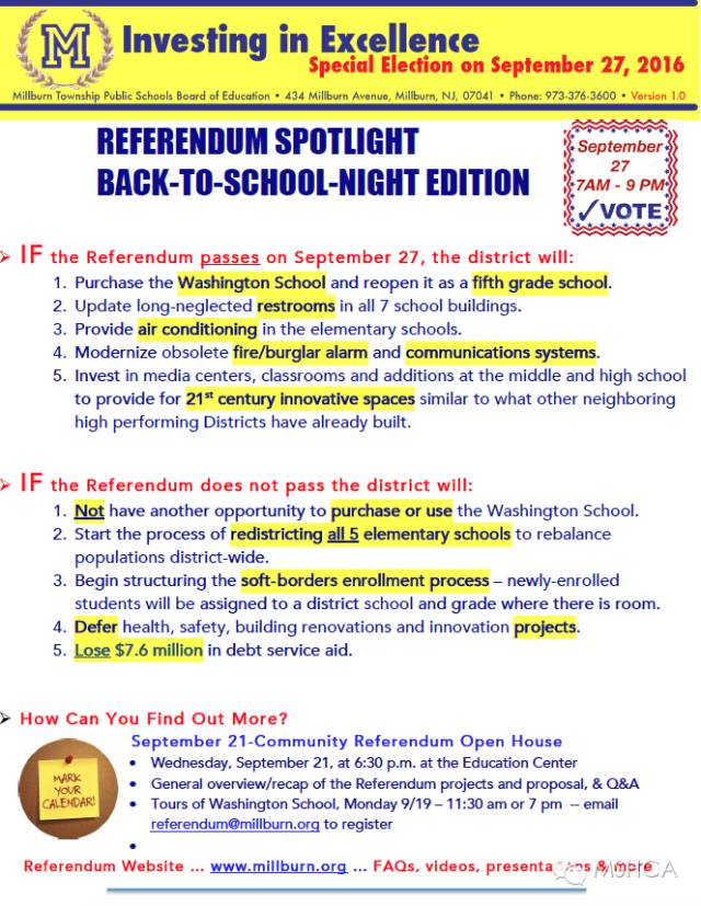 Millburn BOE 9月27号债券公投事关Millburn/Short-Hills未来教育大计及社区发展远景,影响本镇居民及家庭的切身利益。蜜尔本/霄山华人协会鼓励华人社区积极关注,踊跃参加这次公投,为建设我们的家园发出自己的声音。为方便大家对此次公投做深入的了解, 在学区委员Jesse Liu 刘建翔的帮助下,我们汇总一些核心信息如下,供大家参考: